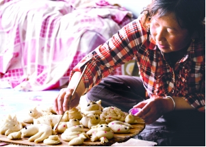 制面塑的工具比較簡單:有剪刀、菜刀、梳子、紅棗、花椒、紅豆等物。只要掌握好發(fā)面技術(shù),按照式樣進行捏制,那么一個鮮活的面模形象就會脫穎而出。面塑的藝術(shù)的特點是“一印、二捏、三鑲、四滾”另外還有“文的胸、武的肚、老人的背脊、美女的腰”。