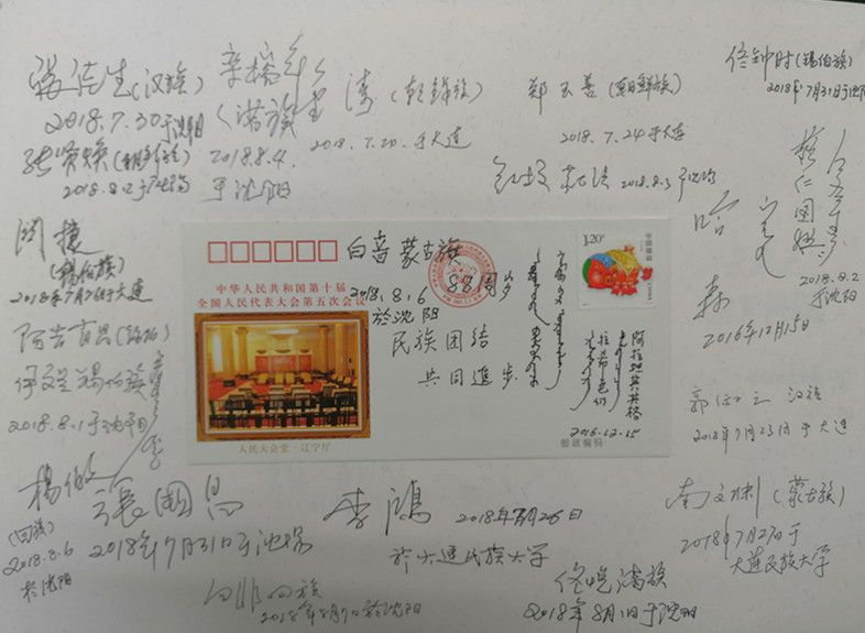 在采集口述影像錄音資料的同時(shí),項(xiàng)目組還收集了大量的珍貴歷史照片以及相關(guān)文物。值得一提的是,他們設(shè)計(jì)了一種非常有特色的受訪者簽名簿,中間貼著繪有56個(gè)民族的音樂舞蹈圖案的首日封或明信片,四周簽上受訪者的人名簽名字、民族特征,有些還用民族文字書寫,體現(xiàn)了中華各民族團(tuán)結(jié)在一起的精神風(fēng)貌。簽名簿有厚厚的幾大本,設(shè)計(jì)精美,承載著民族工作口述史資源采集的經(jīng)歷,具有豐富的文化內(nèi)涵和博物館收藏價(jià)值。