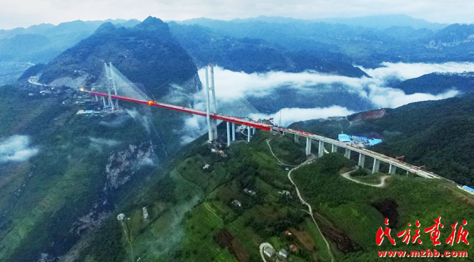 我國東西橫線大通道杭瑞國家高速公路的關(guān)鍵節(jié)點——畢節(jié)至都格高速公路北盤江大橋。該橋橋面到谷底垂直高度達(dá)569.66米,為世界第一高(鄧剛 攝影)