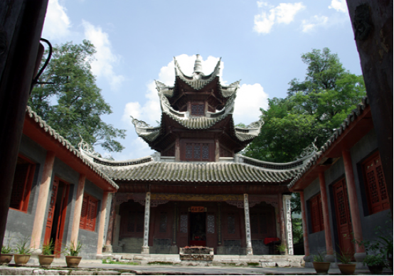 冠山,位于貴州龍里冠山盆地(縣城)東隅,巖山形似金鐘撲地,古木參天,蔥郁蒼翠。明永樂七年(1409)始建的道教活動場所掩蔽其中,可謂“山不在高有仙則名”。在歷史的長河中,雖然道教一去不復返,但其紫虛觀主體建筑保存尚好,現列為省級文物保護單位,由主體建筑紫虛閣、左右?guī)俊⑶暗?、山門、文昌祠組成二進院式古建筑群。主體建筑為木構穿斗式三重檐六角攢尖筒瓦頂,1989年遷入的文昌祠,為木構抬梁式歇山青瓦頂,帶吻正脊,戧脊翹角卷草,石質柱礎浮雕仙草、竹、梅、鹿等圖案。西南兩面有1936年題刻的“還我河山”、“巨靈一孹”等七方摩崖石刻。建筑物的形制、布局給人一種古樸、滄桑之感。登閣騁目,遠山峻嶺和鱗次櫛比的樓房盡收眼底,讓人流連忘返。