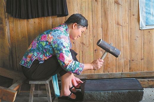 苗族非遺傳承人在錘苗布。