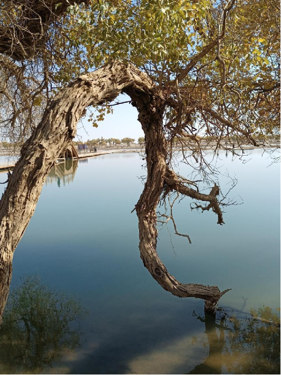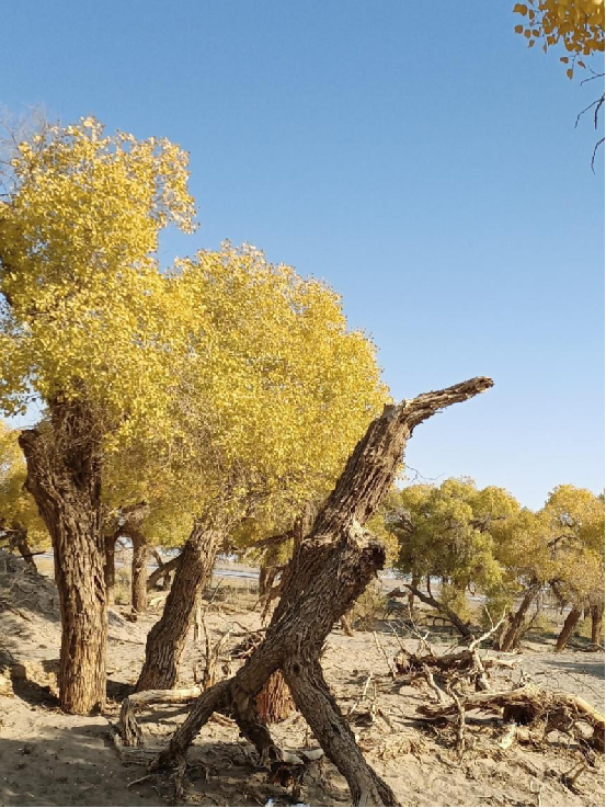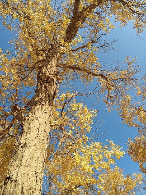每當(dāng)深秋季節(jié),胡楊樹葉變得一片金黃,形成胡楊秋色,樹影婆娑,奇妙絕倫,賞心悅目。漫步在濃郁的胡楊林中仿佛進(jìn)入神話般的仙境。茂密的胡楊千奇百怪,神態(tài)萬般。粗壯的幾人難以合抱,挺拔的七、八丈之高,怪異的似蒼龍騰越,似虬蟠狂舞,令人驚奇不已,嘆為觀止。僅就密密匝匝的樹葉,也是風(fēng)采獨有。幼小的胡楊,葉片狹長而細(xì)小,宛若少女嫵媚的柳眉,人們常常把它誤認(rèn)為柳樹;壯齡的胡楊,葉片又變成卵形、闊卵形或三角形,猶如興安嶺的白樺;進(jìn)入老年期的胡楊,葉片才定型為橢圓形。更令人稱奇者,在同一棵胡楊樹冠的上下層次,還長著不同形狀的葉片,因此,又稱“異葉楊”