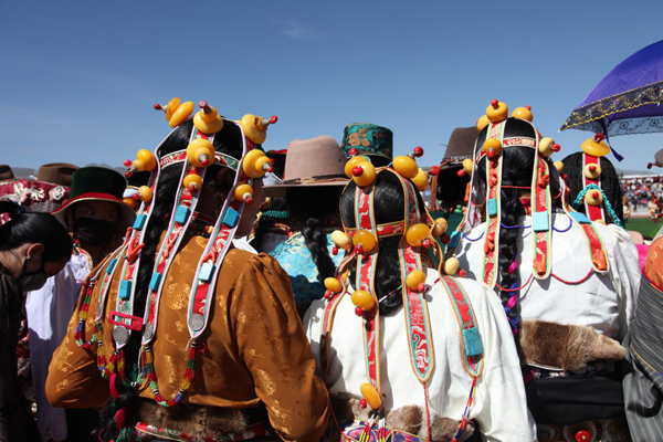 藏族婦女發(fā)飾因地域之別而顯得豐富多彩。西藏部分地方的婦女喜戴巴珠,拉薩附近的婦女所戴三角形巴珠,平系與頭頂,兩枝向前,將分梳的兩條發(fā)辮分別盤在兩枝上。日喀則、江孜一帶的婦女戴弓形巴珠,弓背向上,梳成多條的發(fā)辮分別掛在弓的兩端。貴重的巴珠上面鑲有珊瑚、瑪瑙等,顯得富麗堂皇。姑娘一戴巴珠,就意為著長大成人,因此,第一次戴巴珠時,家中要為姑娘舉行傳統(tǒng)的成人儀式。
