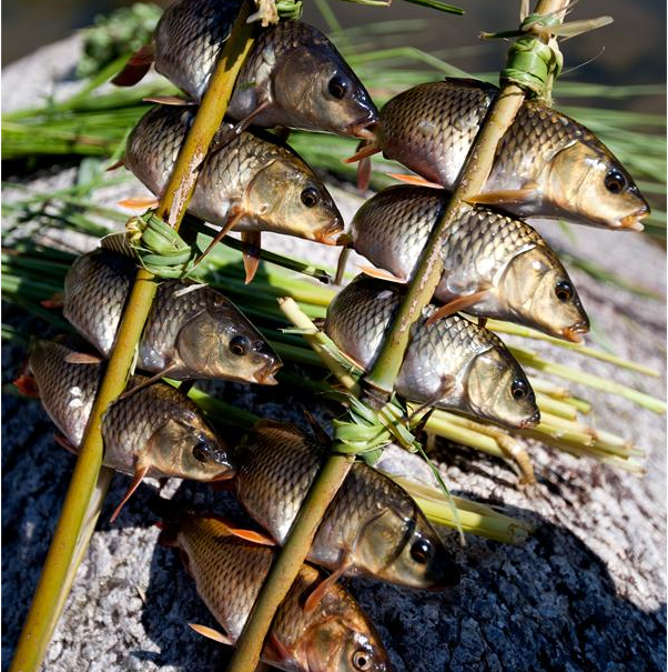 燒魚(yú)是廣西融水苗胞的習(xí)俗之一,融水的苗族同胞素有在稻田里養(yǎng)魚(yú)的習(xí)慣,每年春插,苗家人向來(lái)喜歡在稻田里放養(yǎng)鯉魚(yú)。每年的秋收稻黃時(shí)節(jié)也是田鯉肥壯之時(shí),這時(shí)來(lái)自四鄉(xiāng)八寨眾多的各民族兄弟便匯聚起來(lái),點(diǎn)燃一堆堆篝火,燒田鯉吃野餐,盡享豐收喜悅。燒魚(yú)從9月稻黃收割開(kāi)始持續(xù)到12月底才正式結(jié)束,故名“元寶山金秋燒魚(yú)季”。燒魚(yú)季節(jié),苗寨家家戶戶釀起醇濃的甜酒,蒸著香噴噴的糯米飯,帶上食鹽、辣椒、蒜苗、蔥花、薄荷等佐料上山去剪禾。晌午時(shí)候,他們?cè)谔镱^或田邊的平地?zé)鹨欢讯洋艋?,從田里抓?lái)一籠籠活蹦亂跳的鯉魚(yú),用樹(shù)枝或竹片把魚(yú)一條條串起,排成一排,然后放在紅彤彤的火炭上翻來(lái)覆去地烤,大約半小時(shí)左右,魚(yú)被烤炙得“呲呲”作響,水分烤干,慢慢地變黃,直至熟透,香飄四溢,遠(yuǎn)遠(yuǎn)就可聞到香味。