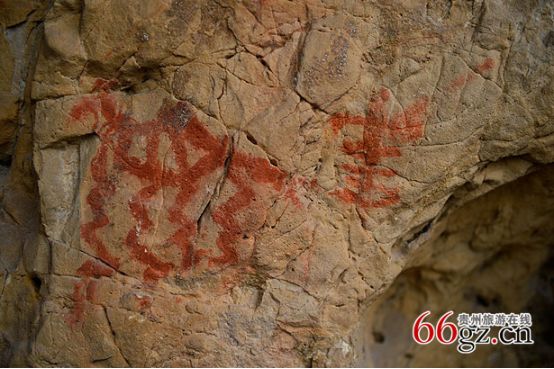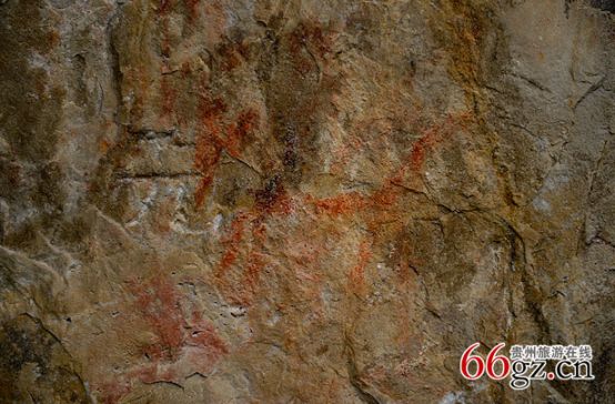 據(jù)資料載,金山洞古代崖畫以赭色涂繪人、馬、狗等等,隱約可見形態(tài)各異的大小圖像二三十個(gè)。人物多作行走狀,亦有雙手高舉者,似乎在祈禱。從其畫風(fēng)觀察,與相距不遠(yuǎn)的省級(jí)文物保護(hù)單位--長(zhǎng)順龍家院崖畫十分相似。