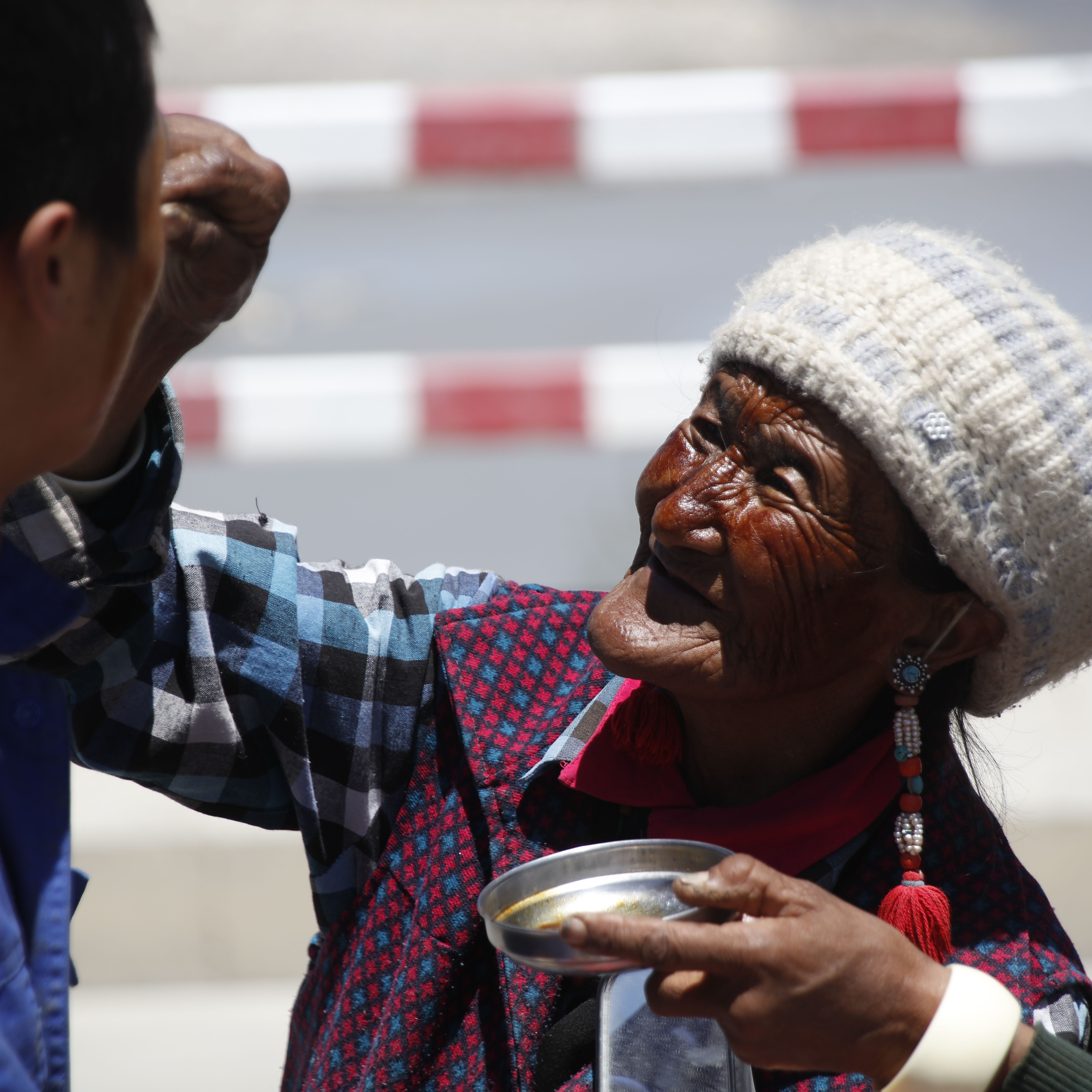 圖片說明:老奶奶把札達(dá)面膜抹在客人臉上